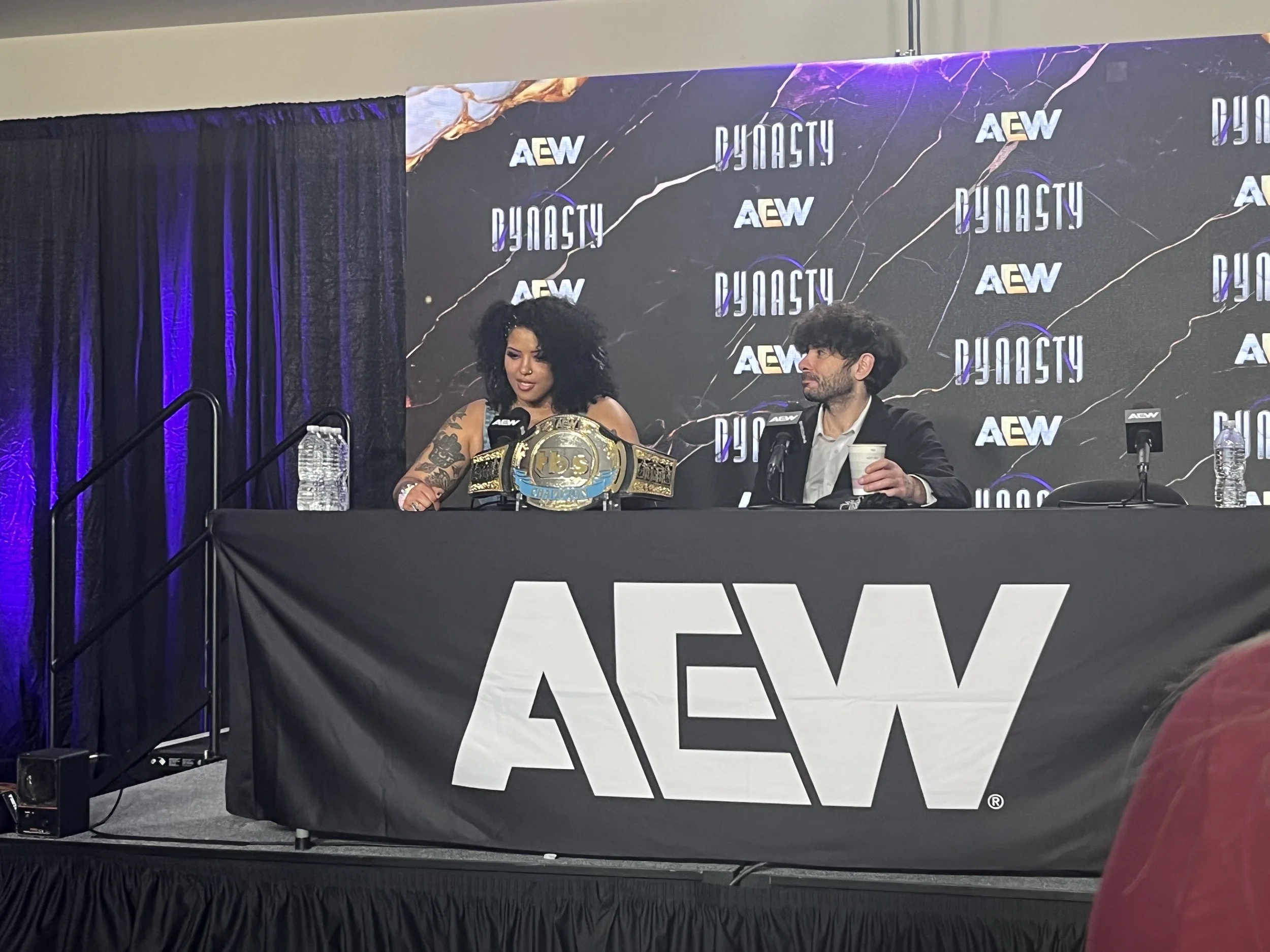 Then, they brought out the AEW women's world champion, Toni Storm, who read a prewritten statement attesting to her own excellence and challenging the media to dare to ask her any follow-up questions. There was a tense silence in the room for a few moments, and it genuinely looked like no one was gonna ask the world champion a question, but that doesn't work for me, brother. But I didn't come all this way to sit here, and I'm not sure what I was going to ask her, but I was gonna figure it out, dammit. But alas, and probably for the best, when she was asked a question about Mariah May challenging her for the world title, she stormed off, a whirlwind of tulle from her dress in her wake. But honestly, it was a perfectly predictable reaction.